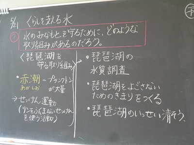 今日の社会は「水のみなもと」について学習しました。これまで、私たちの飲んでいる水は一体どこから来ているのだろう?という疑問を解決すべく、学習を進めます。京都市の水源は「琵琶湖」でした。琵琶湖の水を守るために、どのような取り組みが行われているのかを予想し、教科書を使って調べました。