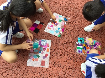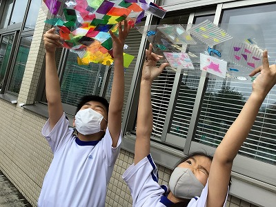 今日はあいにくの雨でしたが、子どもたちの作品が完成するころに雨があがったので、作品を持って運動場に出かけました。