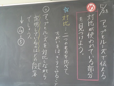 今日の国語の学習は、「アップとルーズで考える」という説明文を読み、「対比」が使われている文章を本文の中から選びました。対比の意味を捉え、この文章では何を対比しているのかを考えながら、本文から段落を選びます。