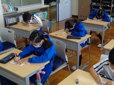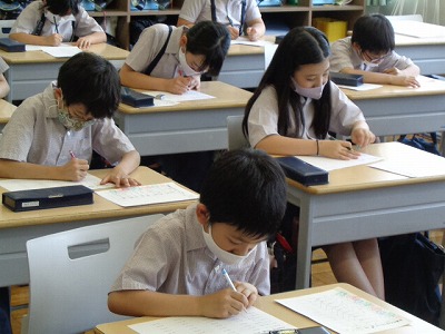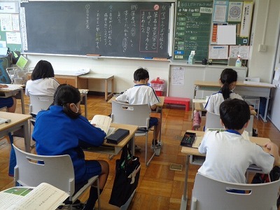 1時間目は、国語の学習です。まずは、毎日取り組んでいる「漢字テスト」からスタートしました。新出漢字を毎日5問ずつテストしています。都道府県の漢字も登場し、普段の学習の積み重ねにより、満点を取れる4年生が増えてきました!