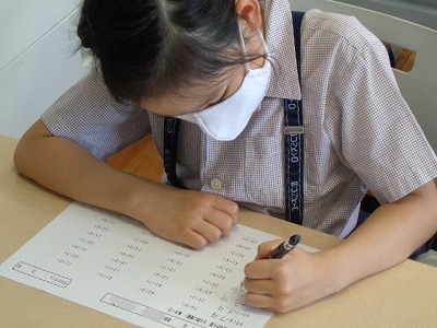 火曜日の昼根っこタイムは、計算練習です。はじめは、7分間で50問を解ききることができなかった4年生も、時間内に正しく解く事ができるようになりました。