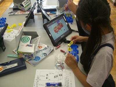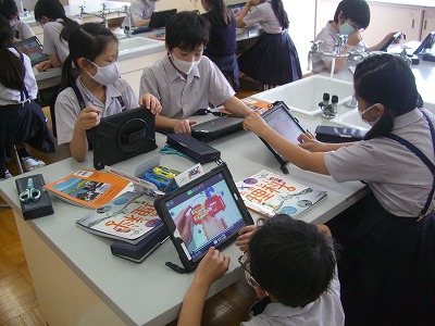 次に、実験セットを使って「直列つなぎ」をしていくのですが、一人一台のiPadが活躍します。