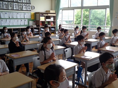 水曜日の朝は、放送礼拝からのスタートです。今週からは、夏制服での礼拝になります。美しい姿勢で合掌し、礼拝を行います。