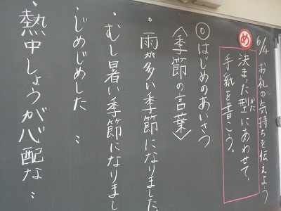 1時間目の国語は「お礼の手紙を書こう」の学習です。今日は、手紙の型にそって実際に手紙を書く準備を行いました。はじめのあいさつの一つである「季節の言葉を使ったあいさつ文」を、みんなで出し合い考えました。梅雨の時季ならではの、季節の言葉を考えます。