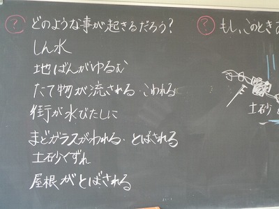 今日は、台風などの水害によって、どのような被害が出るのかについてクラスで話し合いました。現在起きている土砂災害などの話を交えながら、もし家の中でこのような状況に巻き込まれたとき、どのようにすればよいのかを想像してみることにしました。逃げ場がなくなった場合、誰かが助けに来てくれるまで、待つしかないという事も分かりました。