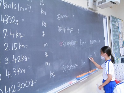 5時間目の算数は「小数」の単元を引き続き学習しています。今日は、はじめに㎞をmに替えたり、㎏をgに替えるなどの単位替えの練習をして、小数と整数の関係性について復習しました。