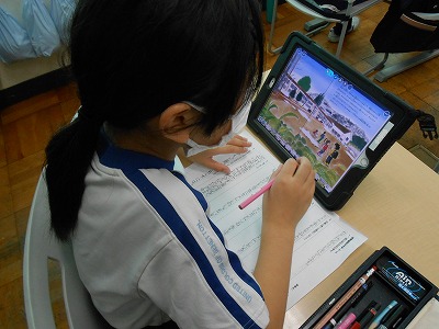 6時間目、社会の学習は「自然災害から人々を守る」という単元です。今日は、前回の授業で調べた「災害を防ぐための取り組み」について発表します。防災意識を高めるためのパンフレット作りから、下水道管の補強工事など、いろいろな災害への取り組みが見つかりました。
