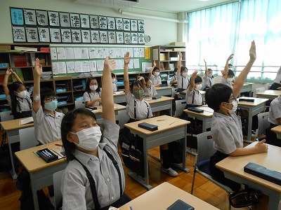 5時間目の算数の学習は、夏休み明けに取り組んだ1学期のまとめテストを返却し、「小数」の単元のまとめ学習を行いました。まだまだ「m」を小数で「km」に表す単位の問題に苦戦している様子です…!くり返し問題を出して、練習しました。