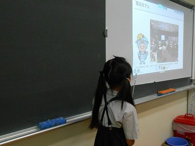 その後は「自分にできる防災」について考えて、ロイロノートでまとめました。防災バックの準備や、避難場所の確認という意見が上がります。いざというとき、近所のどこが避難場所になるのか、お家の中でも話し合いが必要であることが分かりました。
