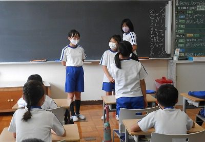 1時間目の学級活動は「スポーツフェスティバル」に向けて、中学年で取り組みたい競技についてクラスで話し合いました。2学期からの新しい議長団が、司会進行を務めてくれます。