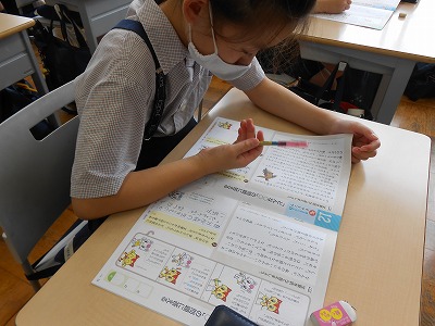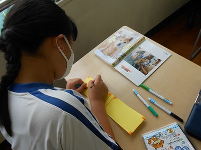 2時間目は国語です。今日は、昨日に引き続き「ノンフィクション作品の本を読んで、帯やポップを作成しよう」という学習目標を持って、作業を進めました。思わず本を手に取ってみたくなるような帯とポップを目指して、本屋さん顔負けのすてきなポップを作成しています!