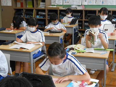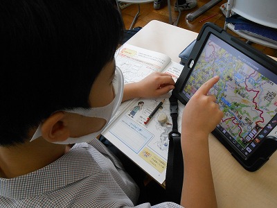 6時間目の社会の学習は、今日から「京都府の特色」について進めます。今日は、教科書の白地図を使用して、デジタル教科書の地図帳とにらめっこしながら、京都の地名について調べました。京都の意外な広さや複雑な土地の形に、みんな驚きの様子です!