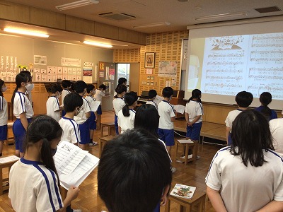 今日は、ピアノ伴奏の低音側(左手)に合わせて斉唱する学習を行いました。