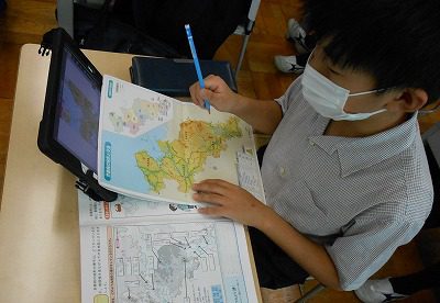 6時間目の社会は「京都府の地名」について白地図を埋めて行きました。今日は、京都の地図帳やタブレットの地図を使いながら、答え合わせをしていきます。京都には「盆地」や「高地」がありますが、それぞれの言葉の意味や特色について考えます。