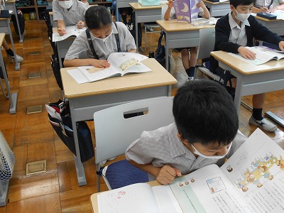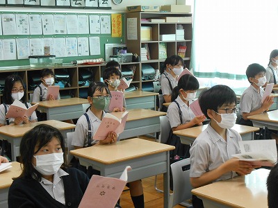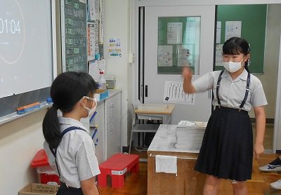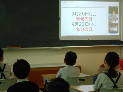 校長先生のお話は、明日の「秋分の日」と「あいさつ」についてでした。4年生は、1学期の学級目標を「元気なあいさつで友達を笑顔にしよう」としていました。もう一度、朝のあいさつの様子をふり返り、あいさつが相手に与える印象について考えます。