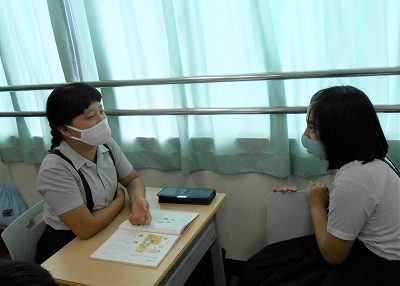 2時間目の国語は「対話を深める」という学習です。今回は、グループでロールプレイを行いながら、「友達を呼ぶため、すぐに部屋を片付けたい姉」と「片付けのために一度すべて物を外に出したい弟」という役柄を、交代しながら対話していきました。