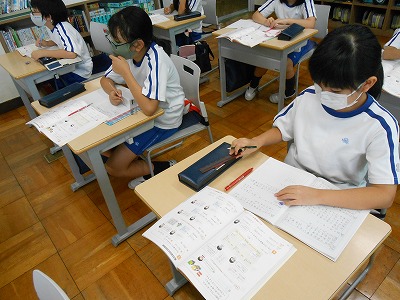 1時間目、月かげの学習で「学級新聞づくり」というお話を読みました。このお話は、チームで協力して学級新聞を作る際にリーダーとなった私が、仲間との意見の違いに悩むお話です。仲間の意見を尊重しつつ、みんなでよりよいものを作っていくためには、どんな心が必要なのか、みんなで意見を出し合いながら考えました。