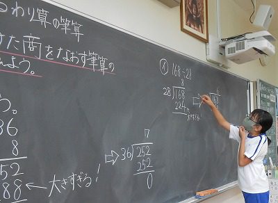 3時間目の算数は「2けたでわるわり算」についての学習です。今日は、見当をつけて立てた商が間違っている場合の筆算の仕方を考えました。