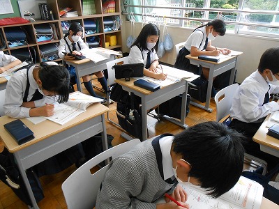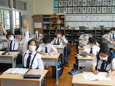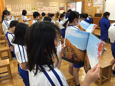 後半は「♪もみじ」の歌唱練習です。歌う前に、まず歌詞を音読しました。そこから見つかる“秋の情景”を発表し合い、教科書の写真と見比べることで、歌唱に生かしたいと思いました。