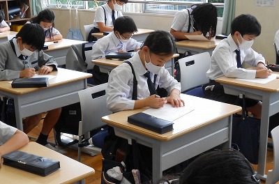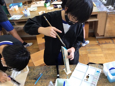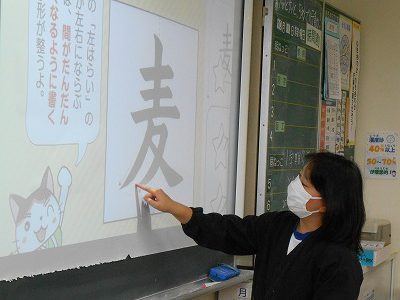 1・2時間目は、久しぶりの「毛筆作品」に挑戦です。まずは、今日書く漢字「麦」について、バランスをとるために、どのような工夫が必要なのか、ワークを使いながら考えます。「麦」や「友」などの漢字は、はらいとはらいの距離をだんだん小さくしていくことで、バランスが取れることがわかりました。その点に注意して、練習を重ねながら真剣に毛筆作品を完成させました。
