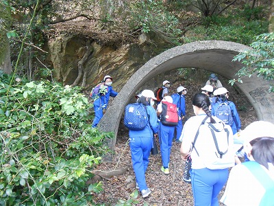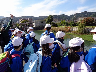 取水口をスタートに、いよいよ疏水を辿って学校へと向かいます。目の前にそびえる大きな山を指し、「あの山を今から越えるよ!」という言葉に、「えーーー!」と驚きの悲鳴が上がっていました。