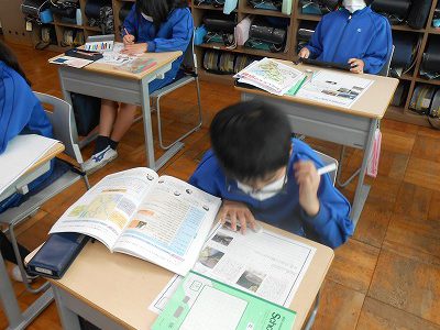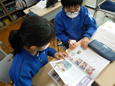 3時間目、国語の学習は「世界にほこる和紙」を終え、今日から伝統工芸について「リーフレット」をつくる学習です。まずは、京都の伝統工芸品について調べました。