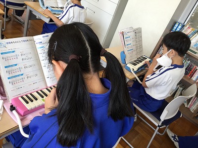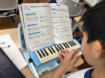教室では、“ふしづくり”に取り組みました。「さくらさくら♪」のような日本の音楽、「ソーラン節」のようなお祭りの音楽、「沖永良部の子守歌」のような沖縄の音楽を題材に、それぞれの「音階」を使った“ふしづくり”です。