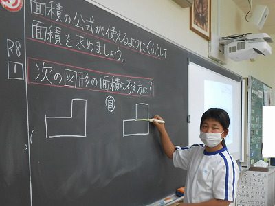 縦に線を引いて2つに分けたり、横に線を引いて2つに分けたり、大きい長方形から、無い部分の長方形を引いたり、色々な方法で面積が求められることが分かりました。