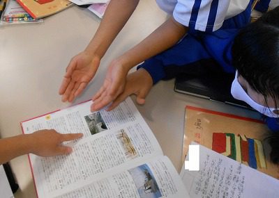 現在、4年生は伝統工芸について調べ学習を行い、リーフレットの作成をしています。百科事典には「柱」と「つめ」があり、それを参考に言葉を探していきます。自分の伝統工芸の名前が、百科事典にのっていないか、一生懸命探していました。