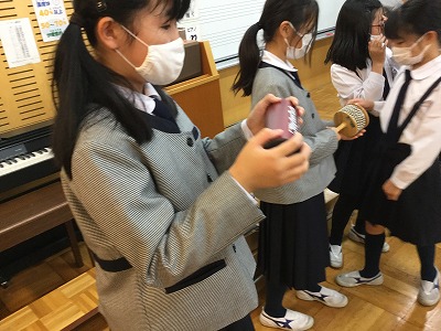 続いては、「おどれサンバ♪」の音楽にのって、リズム楽器を合わせています。