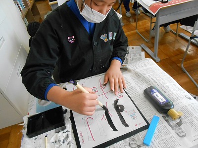 曲がり角でスピードを落とし、三角を描くように筆先をねじります。結びをポイントに練習し、作品を仕上げました。