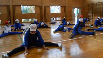マット運動は柔軟性も大切です。身体はすっかり冬の寒さでカチコチになっている様子、ゆっくり息を吐きながらストレッチです。