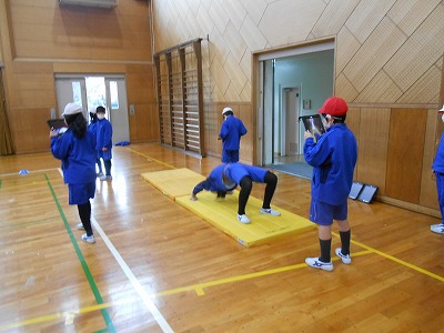 5分間の身体ほぐしをした後は、タブレットを使って、技を記録していきます。自分のフォームを確認したり、友達にアドバイスをしながら、今日は前転などの簡単な技からスタートし、難しい技にチャレンジしていました。