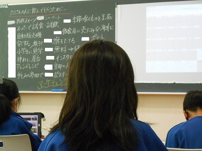 そこで、宇治茶をもっとひろめるために、宇治市ではどんな取り組みが行われているのかについて学習しました。まずは、4年生が予想を立てます。「宇治茶を使った新作スイーツを作る!」「宇治茶のCMを流す!」など、いろいろなアイディアが出てきました。