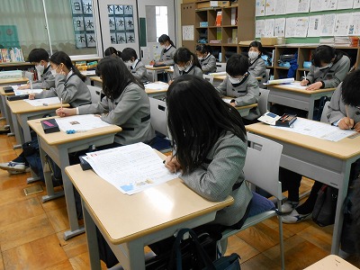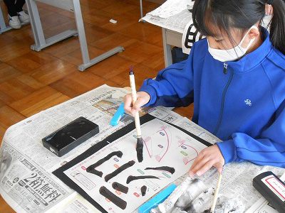 1・2時間目は、書写の学習を行いました。今日は、書き初めに挑戦します。4年生は、学年目標「精進~明るい心で努力する子~」の中にある【明るい心】という字を書き初めしました。