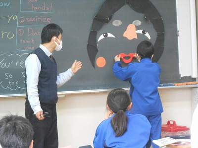 オックスフォード出版のワークより、英単語などを確認すると残り時間はわずかでしたが、お正月でおめでさから恒例の福笑いをしました。