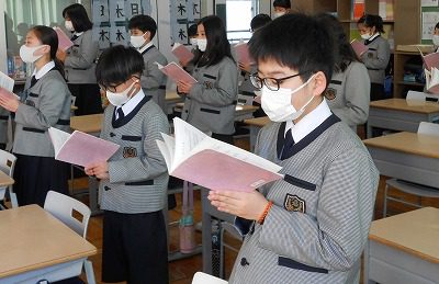 3学期からの放送礼拝は、全員起立で行います。体育館で礼拝をしているときと同じように、背筋をのばして聖歌を歌います。