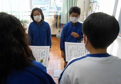礼拝の後は、新児童会の会長さんからの挨拶がありました。4年生の教室でも、これまで活動してくれた旧学級代表に、新学級代表の2人から感謝状が渡されました。