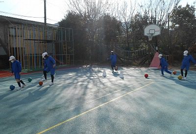 体育の学習は「サッカー」に取り組んでいます。はじめにドリブル練習とボール慣らし運動を行いました。