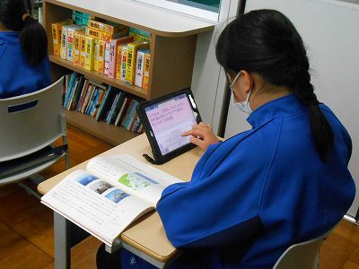 要約はタブレットを使って行います。文章の中で大切な文を見つけ出し、200字程度でまとめていきます。なるべく、同じ言葉が何度も出てこないよう気をつけたり、筆者の文章がそのままになってしまわないように工夫をしていました。