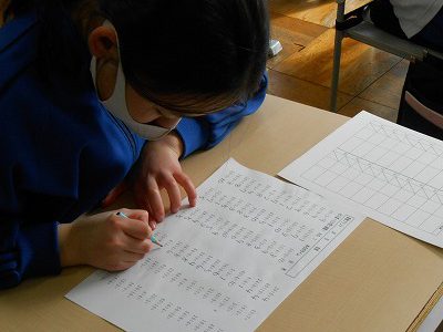 昼根っこタイムでは、3学期に入って初めての「計算」に挑戦です。3学期は、100問のわり算に取り組みます。