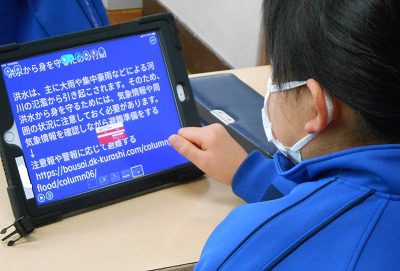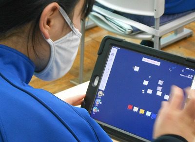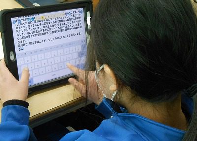 資料の整理を終えたら、次は文章作りです。文章は、タブレットを使って打ち込んでいきます。教科書に書いてある例を参考に、はじめ・中・おわりの構成に気をつけて書きました。
