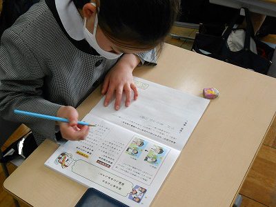 2時間目の国語では「もしものときにそなえよう」の学習を続けています。今日は、集めた資料をもとに、いよいよ文作りを行います。