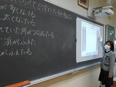 社会は、京都府宮津市について学習しています。今日は、宮津市にある「天橋立」の40年前の写真と現在の写真を見比べながら、どんな所が変化したかについて考えました。