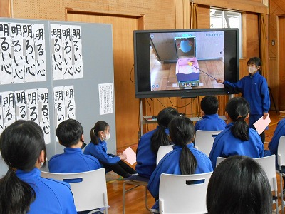 自分達のクラスが書いた「明るい心」という字も、「心」のかき方が一人一人ちがっていて「○○さんの心は、力強い感じ!」「○○さんの心は、やわらかくて優しい感じ」など、字からいろんなイメージをしていました。