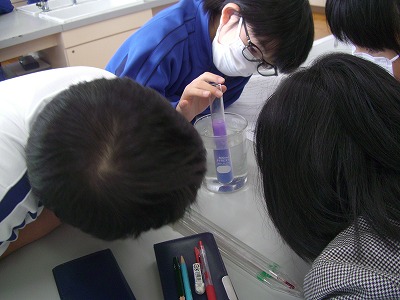 試験管の上の部分か、お湯の水面か、下の方、どこから色が変わるか・・?