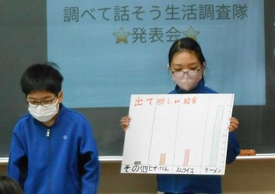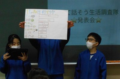 国語は「調べよう、生活調査隊」という単元の学習をしています。これまで、1班~8班までが、「食事」や「趣味」など気になったことをテーマにし、アンケートを作成して調査を行ってきました。
