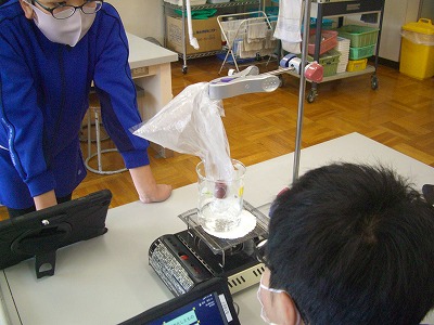 今日は、沸騰したときの「アワ」の正体について予想し、実際に「アワ」を集める実験をしました。