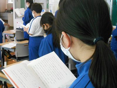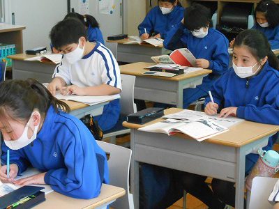 まずは、教科書を持って「音読」を行います。登場する雪うさぎのセリフも、印象的です。「ぼくたちみんな雪うさぎ 雪を降らせる雪うさぎ 片足両足とんとんとん」と、リズムをつけて上手に読めました。