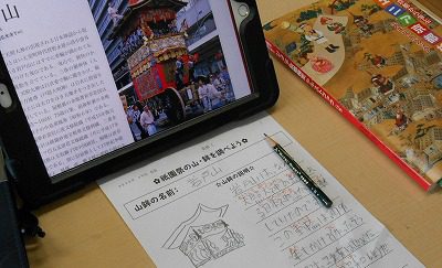 今日は、それぞれの山鉾にどんな意味が込められているのかを調べるため、4年生みんなで「山鉾コレクション」を作ります。タブレットの資料を使いながら、イラストや説明を書きました。